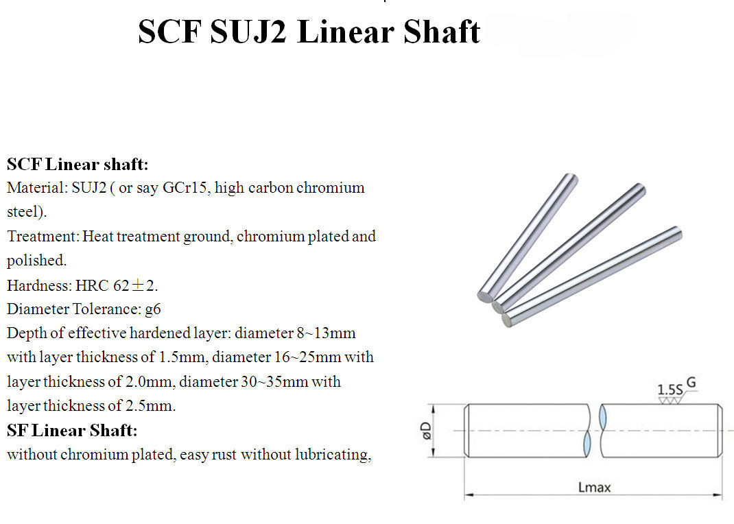 - เพลาสำเร็จ SUJ2 : Linear shaft (พิกัด g6) เพลาเจียรผิว ชุบแข็ง (เพลาแข็ง HRC60 +/-2) และชุบฮาร์ดโครม ใช้กับเพลาลูกปืน Bearing LM LMA LMF LMK หรือนำไปใช้งานเป็นเพลาสไลท์ เพลาลูกปืน ต้องการความแข็งแกร่งและทนทาน